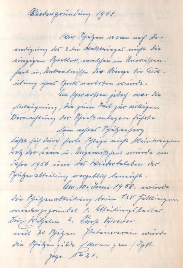 Trotz der Leere u. Ungewissheit wurde im Jahre 1956 um das Wiederbeleben der Schützenabteilung vergeblich bemüht. Am 10. Juni 1958 , wurde die Schützenabteilung beim TSV Hüttlingen wiedergegründet